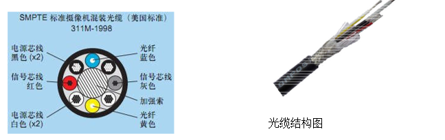 光電復(fù)合纜包含4根HDTV攝像機(jī)供電用的電源線(20AWG)2根信號控制線(24AWG)和2 根用于視頻和音頻傳輸?shù)膯文9饫w